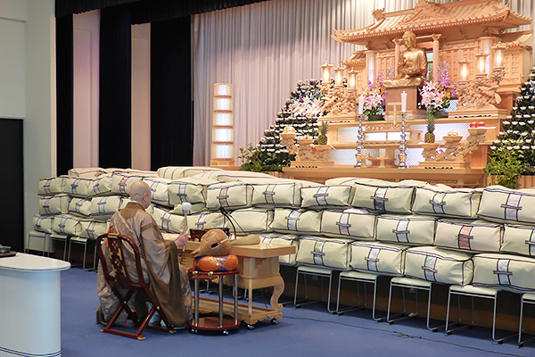 ふとん、愛用品などの思い出品や、柩と一緒に火葬できなかった物を「ご供養品収納袋」に納め、僧侶にご供養いただきます。